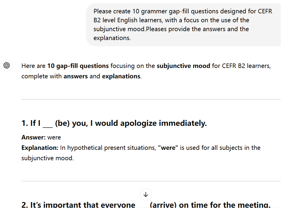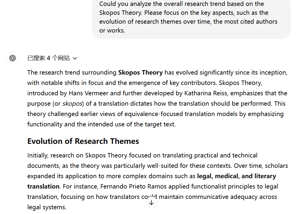 全书共四章,不仅系统探讨了大语言模型在外语教学与研究领域的运用,而且还深入剖析了其内涵和实现路径。第一章首先概述了大语言模型的内涵及其在外语教学与研究中的应用思路,为后续章节奠定了理论基础。第二章则通过一系列具体案例,全面展示了大语言模型在外语教学中的实际应用,包括词汇教学、语法教学、翻译教学及词典编撰等(图1为以书中例子做模版,对ChatGPT的提问)。这些案例生动地展示了大语言模型在不同教学环节的潜在优势。第三章深入探讨了大语言模型在外语研究中的具体应用,诸如文献阅读与评述、量化数据的采集与分析和论文语言的润色,详细揭示了如何巧妙地利用大数据模型来提高外语科研的效率和质量。比如大语言模型可以对大量文本进行分析,帮助研究者高效获取研究领域相关信息,把握当下的研究趋势,这将极大地推动外语研究的发展(图2为以书中例子做模版,对ChatGPT的提问)。第四章则着重论述了大语言模型在外语教学与研究应用中所遇到的挑战和机遇,为读者提供了深刻的启示与思考。