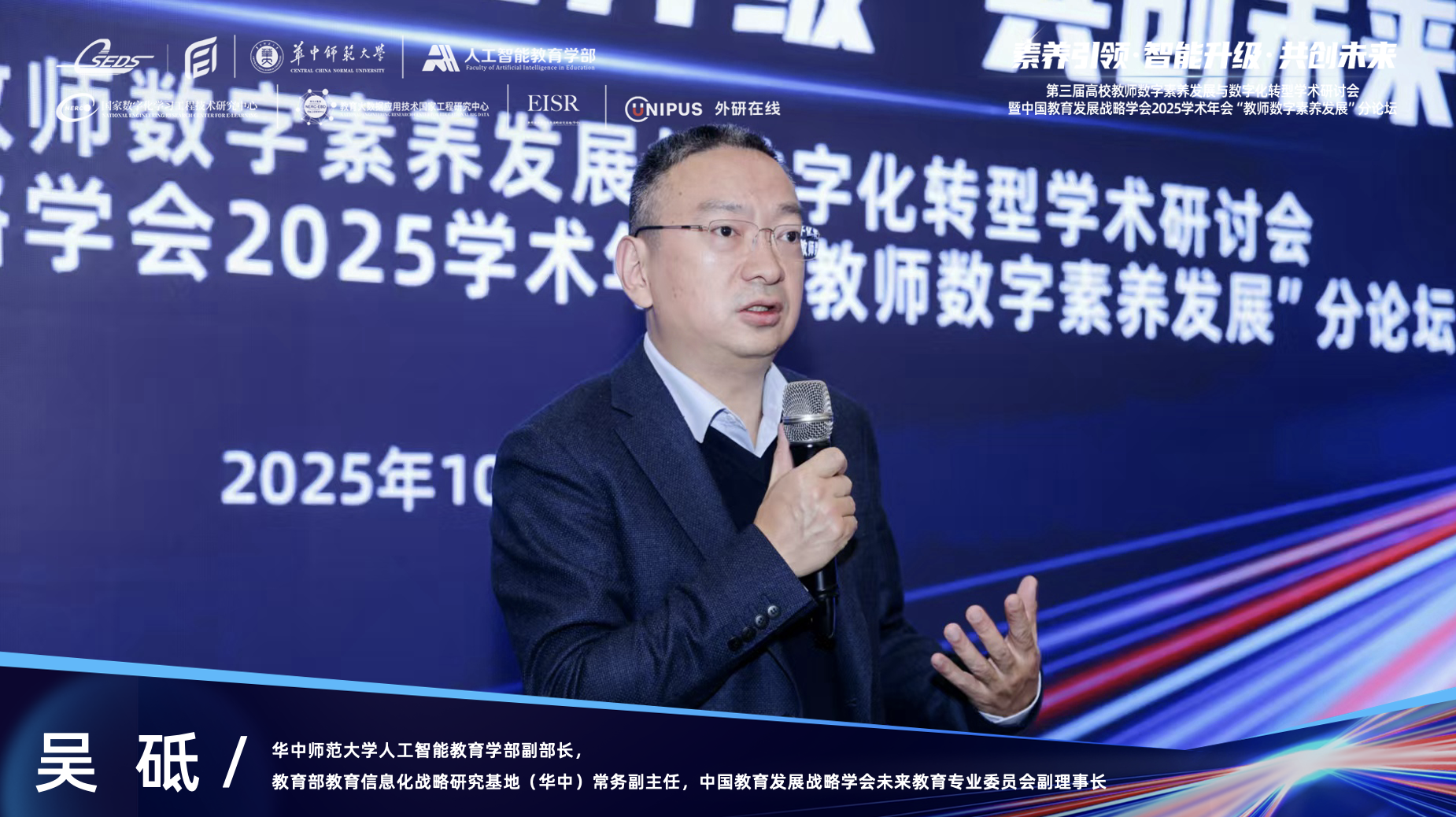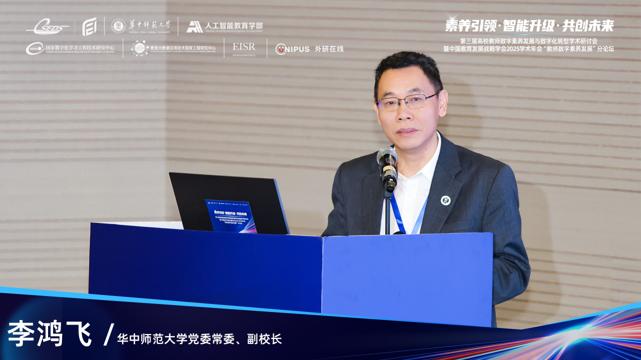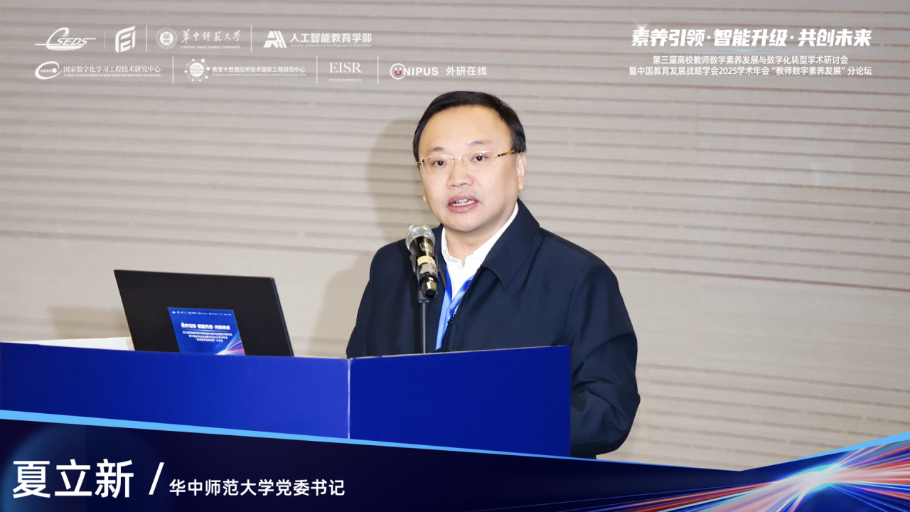 华中师范大学党委书记夏立新在致辞中分享了华中师范大学在教师数字素养提升方面的三大实践:以标准研评为引领构建发展新体系,以平台构建为支撑赋能教学能力提升,以实训赋能为抓手探索卓越教师培养新路径。他呼吁与会者共研前沿议题、共享创新实践、共促协同发展,共同为教育强国建设贡献智慧与力量。