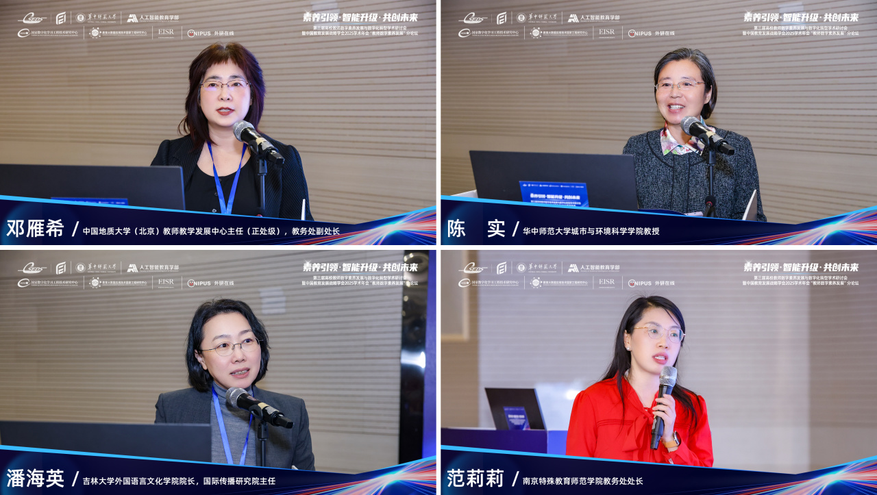 中国地质大学(北京)教师教学发展中心主任(正处级),教务处副处长邓雁希通过“教师数字素养提升的模式创新与实践探索”,介绍了学校基于iTeach平台开展规模化应用验证,探索“以赛促教、以研促改”的骨干教师数字素养提升及培养模式的过程与经验;华中师范大学城市与环境科学学院教授陈实以“建构知识图谱可以提升职前地理教师的TPACK水平吗?一项来自准实验研究证据”为题,分享了构建知识图谱对教师TPACK水平的提升效果,为利用知识图谱优化教师教育课程、促进教师专业能力发展提供了实证依据;吉林大学外国语言文化学院院长、国际传播研究院主任潘海英聚焦“外语教师AI素养诊测:数据画像、关键短板与改进路线”,指出学校使用iTeach平台为外国语学院教师进行诊测,通过多项举措开展教师数字素养提升,并积极探索AI优化教学设计,取得了显著成果;南京特殊教育师范学院教务处处长范莉莉带来“智慧赋能 融合共生——南京特殊教育师范学院数字化教学改革的探索与实践”,表示学校通过iTeach平台对全校师生开展精准测评和靶向培训,实现显著提升,多项课题研究成果获省级奖项并入选典型案例;同时将教师数字素养与人工智能评分纳入教师职称评审,将课堂教学有机融入信息技术的能力纳入教师课堂教学质量评价体系,形成了教师数字素养提升有效机制,赋能特殊教育师资培养与数字化转型。