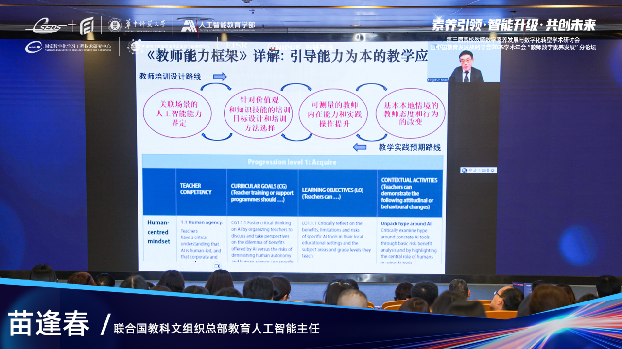 联合国教科文组织总部教育人工智能主任苗逢春以视频形式带来“《教师人工智能能力框架》与实施”。他介绍了《教师人工智能能力框架》的时代背景与推进目标,详细解读了意识、伦理、应用、教学整合及专业发展五大能力维度。他同时建议应通过严格把关监管、规范课程评价、贯通培训体系等路径,促进教师成为学生学习的智慧引导者。