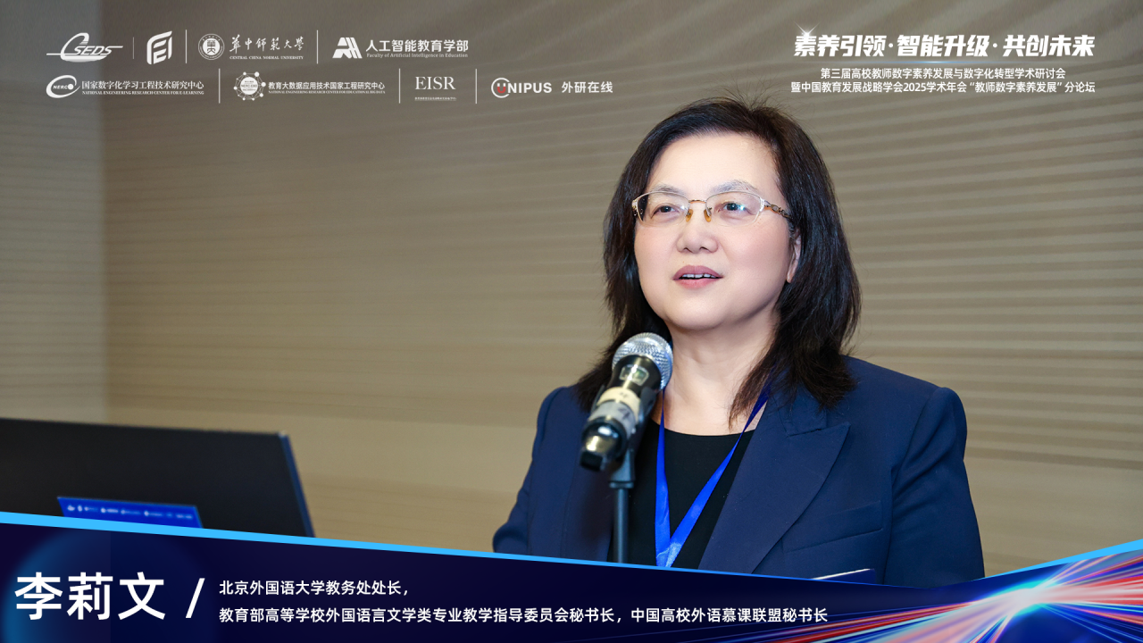 北京外国语大学教务处处长,教育部高等学校外国语言文学类专业教学指导委员会秘书长,中国高校外语慕课联盟秘书长李莉文围绕“AI重塑外语人才培养模式与教师数字素养提升”,分享了学校重构“建—用—评—管”外语教育新生态、创设智能教学新场景、构建精准研训新路径并实现教师发展新闭环的经验,指出学校作为第一批教师数字素养评价、发展与研究示范基地院校,依托iTeach教师数字素养AI平台(即“iTeach平台”)进行新入职教师数字素养诊测,构建“诊断—培养—发展”三位一体提升体系,有效推动教师数字化教学能力发展。