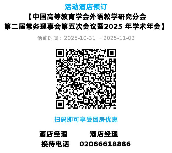 由中国高等教育学会外语教学研究分会、中国高等教育培训中心联合主办、广东外语外贸大学承办的“中国高等教育学会外语教学研究分会第二届常务理事会第五次会议暨2025年学术年会”将于2025年10月31日—11月2日在广东外语外贸大学举办。本届年会主题为“服务国家重大战略的外语教育创新与实践”,旨在探讨教育强国建设背景下的高质量外语教育体系建设,研究如何培养担当民族复兴大任的时代新人,为实现中国式现代化提供卓越人才和智力支撑。