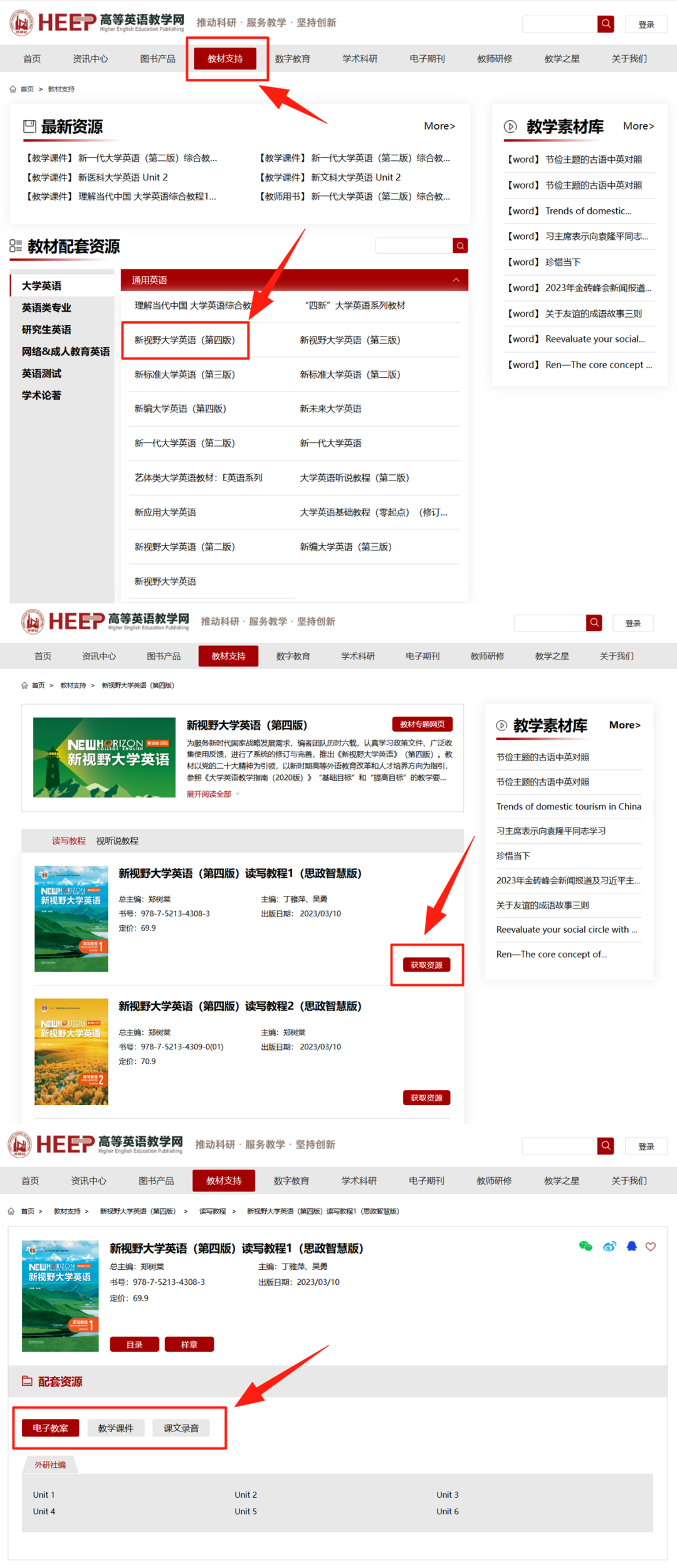 登录heep.fltrp.com/support,点击所需教材,选择具体分册,点击“获取资源”。