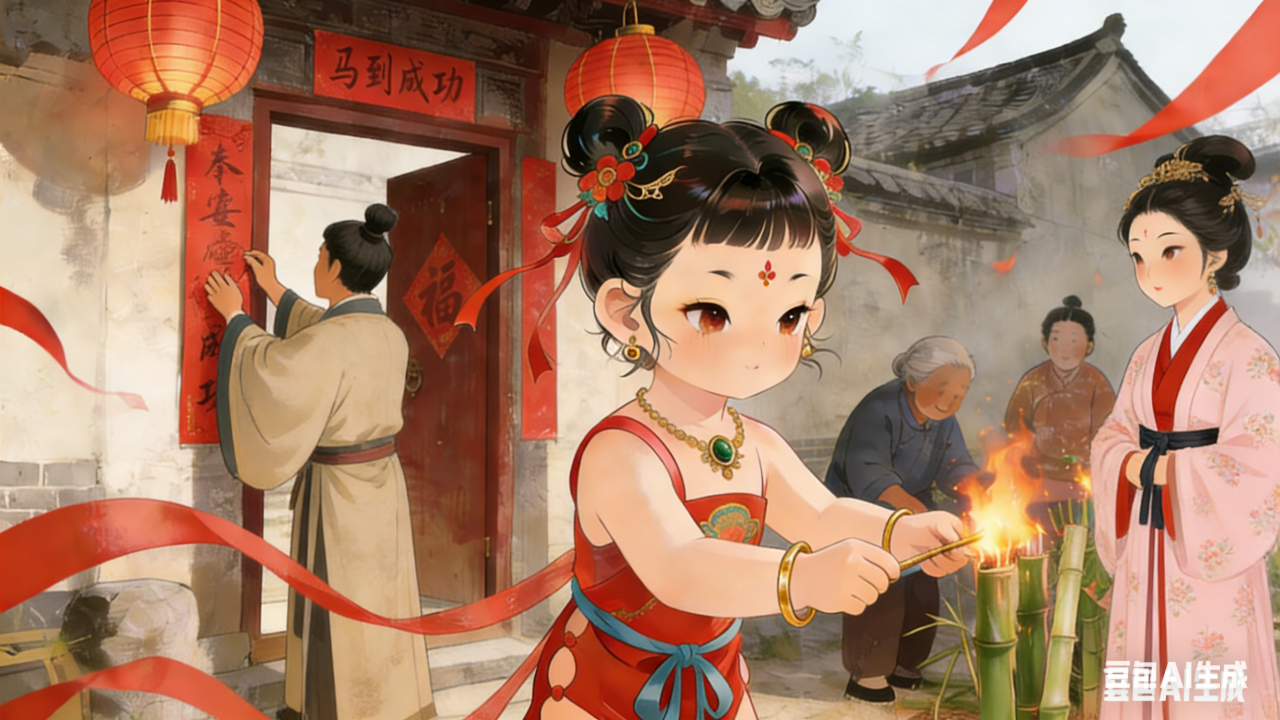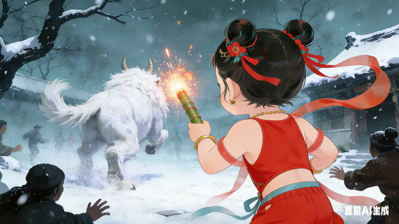 Even though Nian made several attempts, Xi was still on the run. Fortunately, Nian was smart and good at observing. By chance, he discovered that Xi was afraid of loud noises; therefore, he drove Xi off with the cracking sound of burning bamboo.