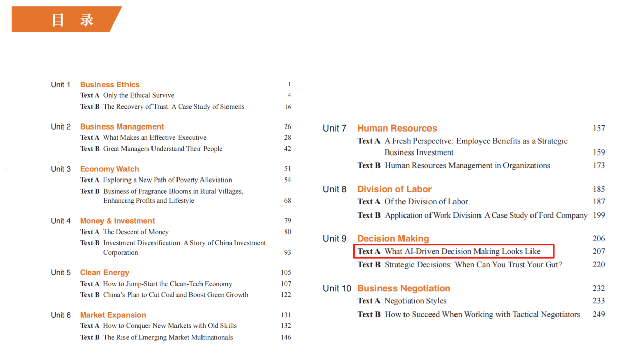 选取经济、管理、法律、文化等多元领域商务选篇,新增绿色经济、数字转型、人工智能等时代性主题,构建与行业动态同步更新的商务知识体系。