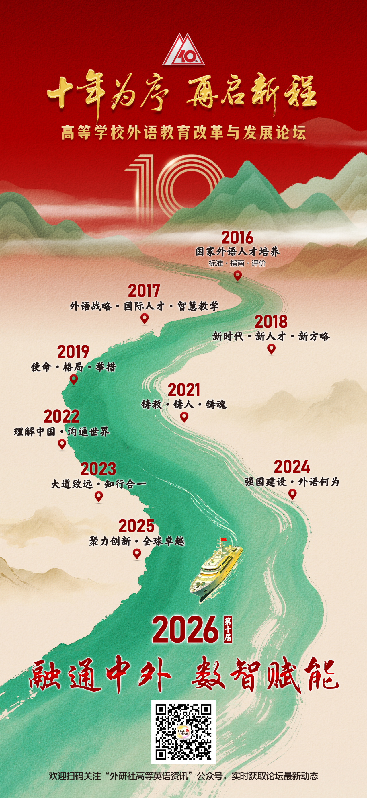 十年为序,再启新程。2026年3月20—22日,第十届高等学校外语教育改革与发展论坛将在北京举办。本届论坛主题为“融通中外,数智赋能”,锚定“十五五”教育发展目标,与全国高等外语教育同仁并肩,以创新变革答时代之问,以砥砺奋进赴强国之约,为全面推进中华民族伟大复兴、开启“十五五”新局持续贡献外语力量!