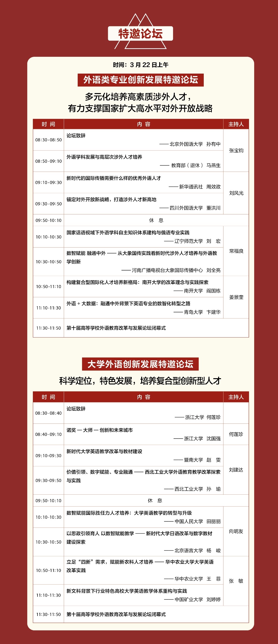22日上午,外语类专业创新发展特邀论坛与大学外语创新发展特邀论坛将同步召开,指引高素质涉外人才、复合型创新型人才培养新方向与新路径。
