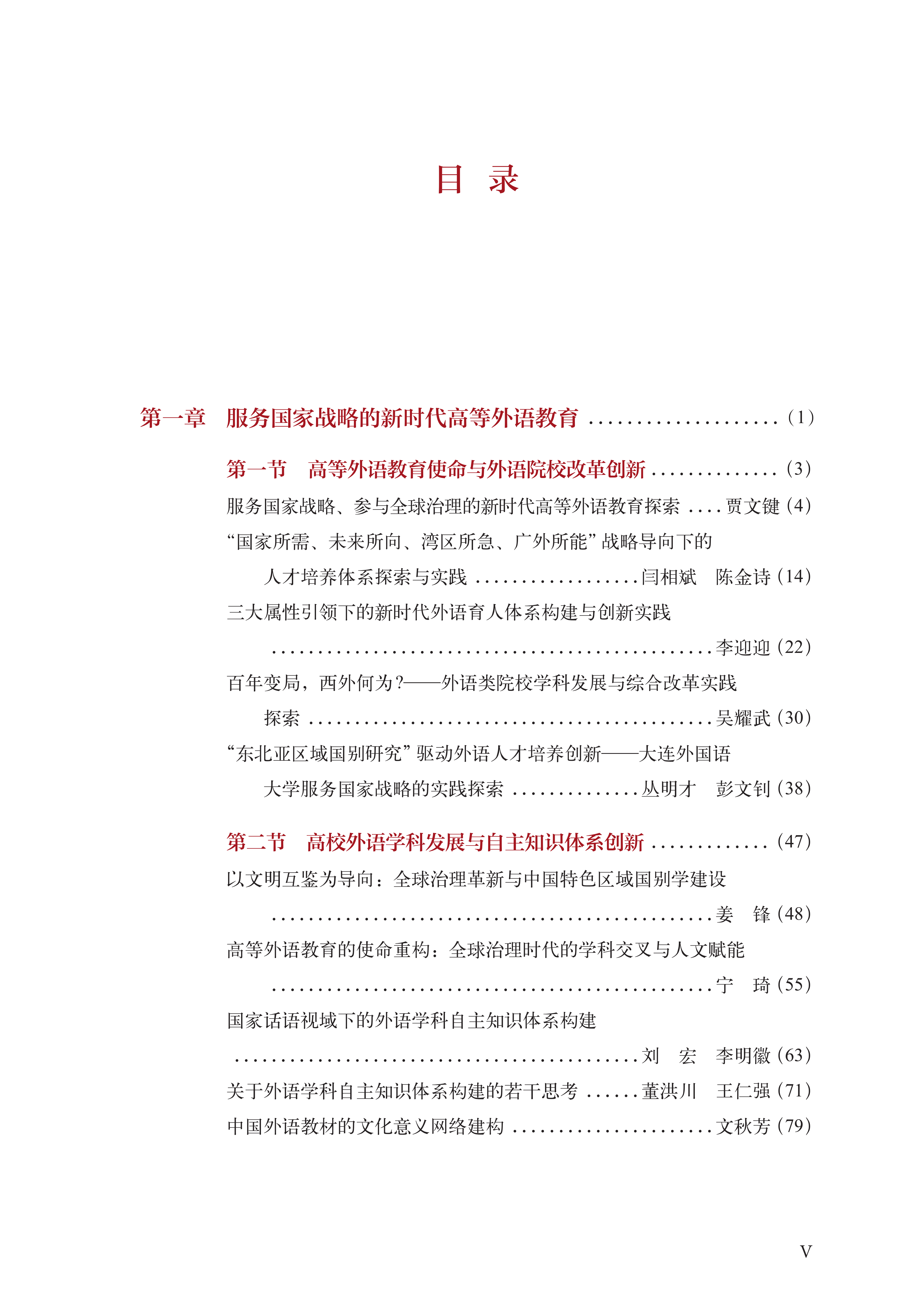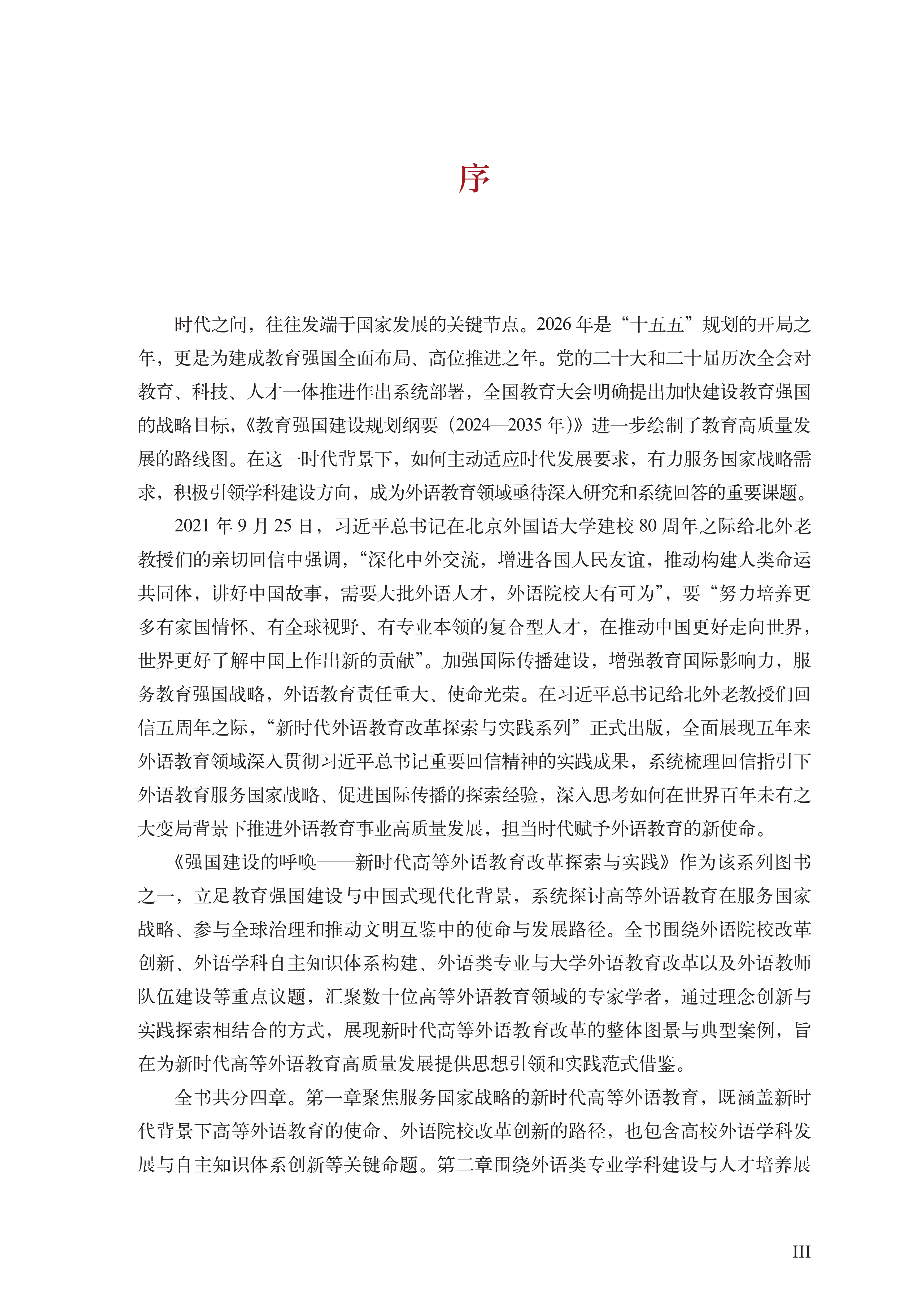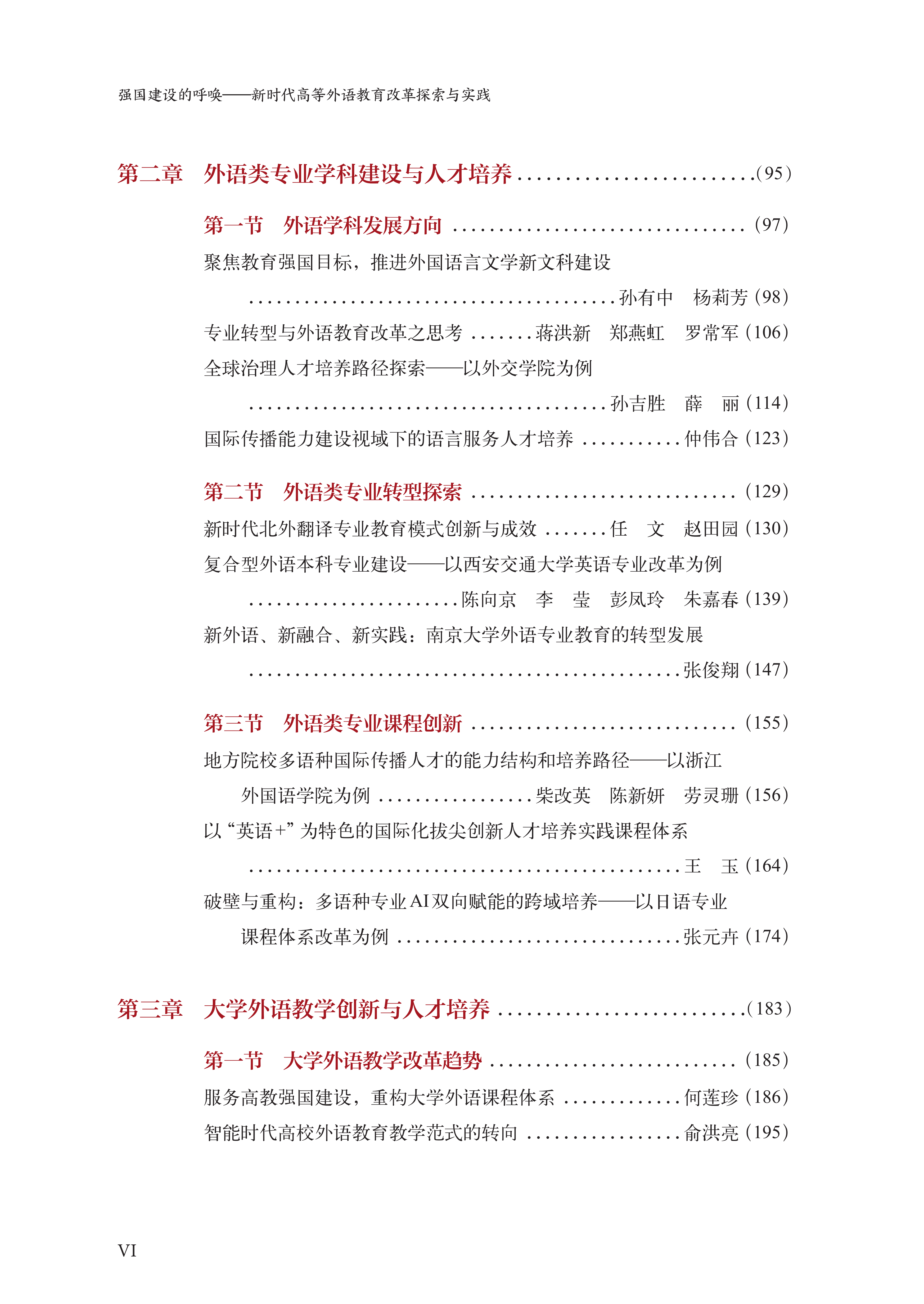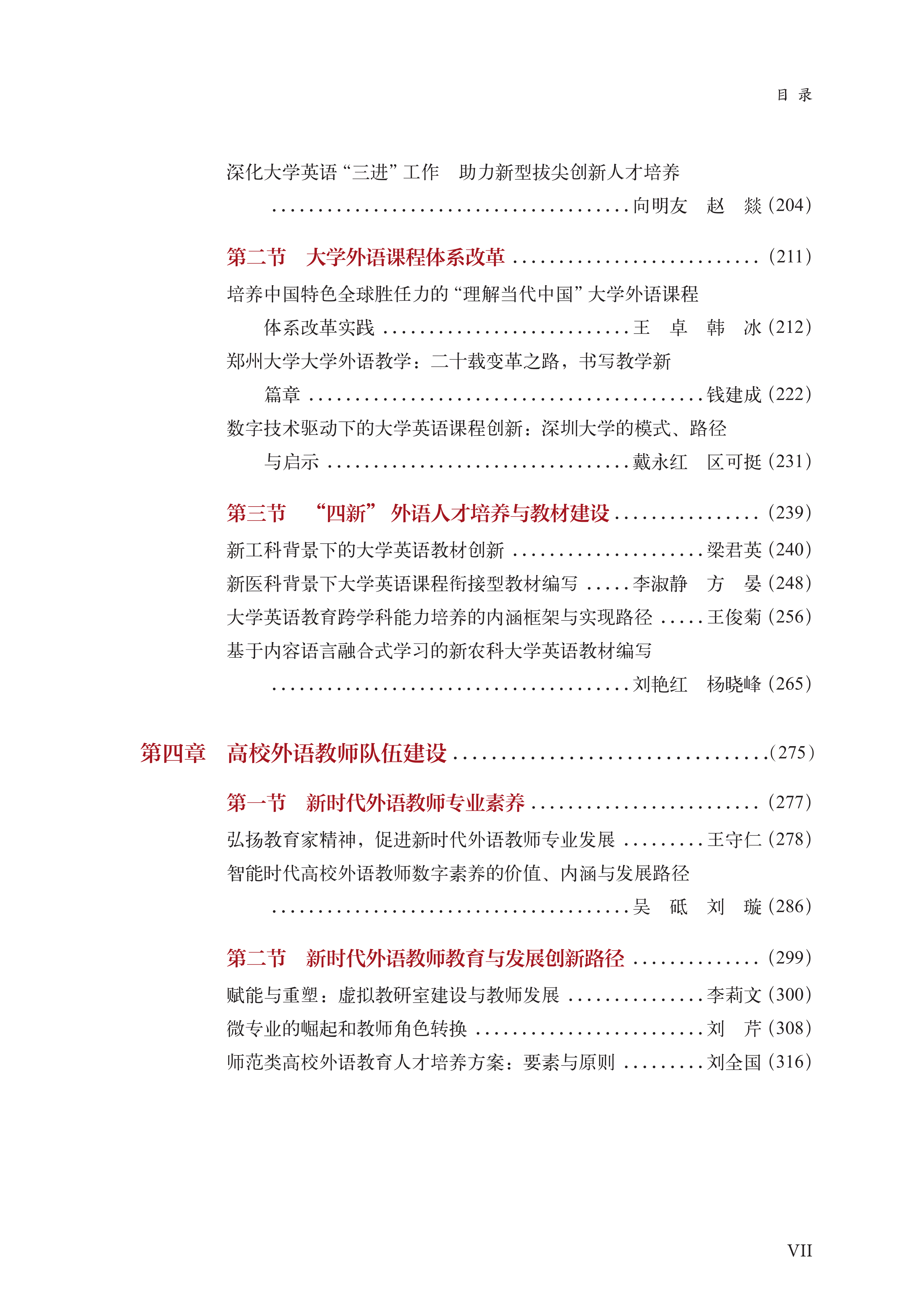 全书共分四章。第一章聚焦服务国家战略的新时代高等外语教育,既涵盖新时代背景下高等外语教育的使命、外语院校改革创新的路径,也包含高校外语学科发展与自主知识体系创新等关键命题。第二章围绕外语类专业学科建设与人才培养展开,系统呈现外语学科发展方向、外语类专业转型探索、外语类专业课程创新等,旨在为外语类专业转型提供可借鉴的范式。第三章重点关注大学外语教学创新与人才培养,分析大学外语教学改革趋势、大学外语课程体系改革、“四新”外语人才培养等,展现了大学外语教学改革的方向与实践。第四章着眼于高校外语教师队伍建设,探讨新时代外语教师专业素养和新时代外语教师教育与发展创新路径,着力构建支撑外语教育高质量发展的教师发展新生态。