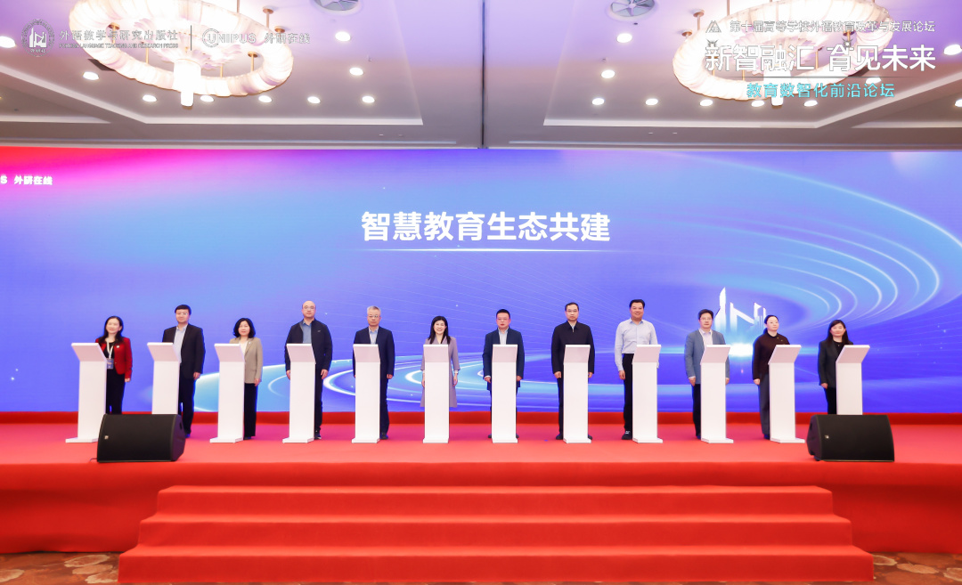 论坛最后,来自中国产业海外发展协会、中国欧洲经济技术合作协会产业出海工作委员会、新华社国家重点实验室区域国别时空智能研究室、英国文化教育协会、中国人工智能产教融合研究院、腾讯云·腾讯教育、阿里云、亚马逊云科技、火山引擎、北京中博数智科技有限公司及多所院校的代表与外研社、外研在线共建智慧教育新生态,在数字教材、智能平台、教师发展、学科转型、产教融合、智慧空间等方向多维探索、加深合作。