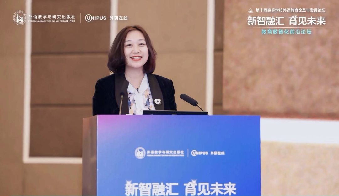 西安外国语大学党委委员、副校长邓滢分享了学校在“AI+外语”人才培养方面的创新实践。她指出,人工智能正深刻重塑各行各业的发展形态,面对国家战略与区域发展需求,西外构建了“外语+专业+人工智能应用”三位一体的融合培养模式,在学科专业布局、人才培养体系重构、实践创新体系构建等方面取得丰硕成果。她表示,学校与外研社联合策划多语种数字教材,探索开展外语教育一体化智能平台及更多类型智慧空间建设,持续深化“AI+外语”教学改革,推动数智技术与教学场景深度融合。