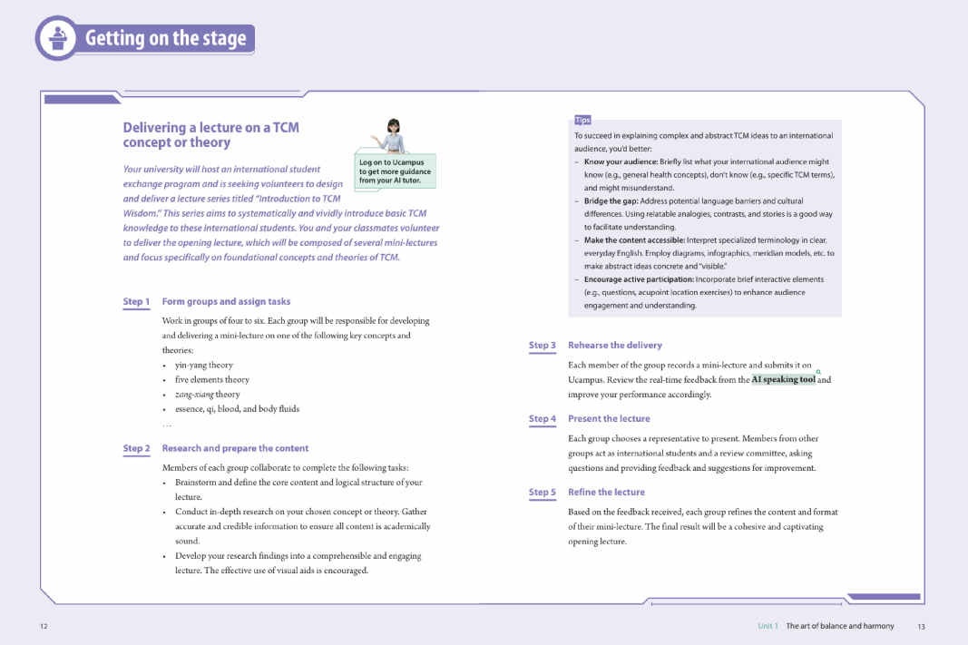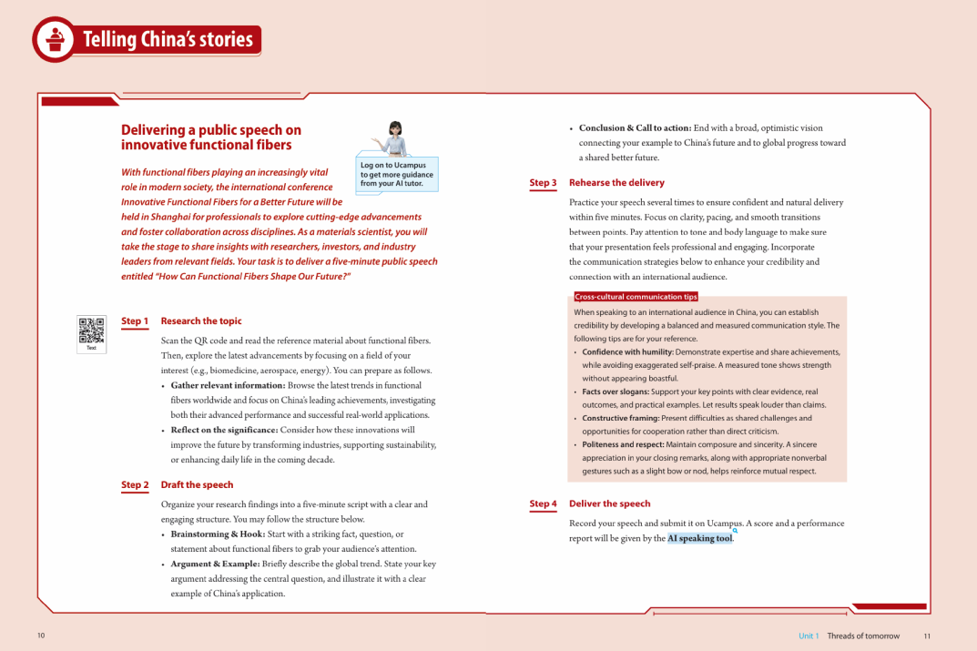 教材引入AIGC,提供AI助教、AI口语/写作/翻译评阅、AI口语陪练、AI学情分析等功能,构建全流程、个性化、沉浸式智慧学习环境。
