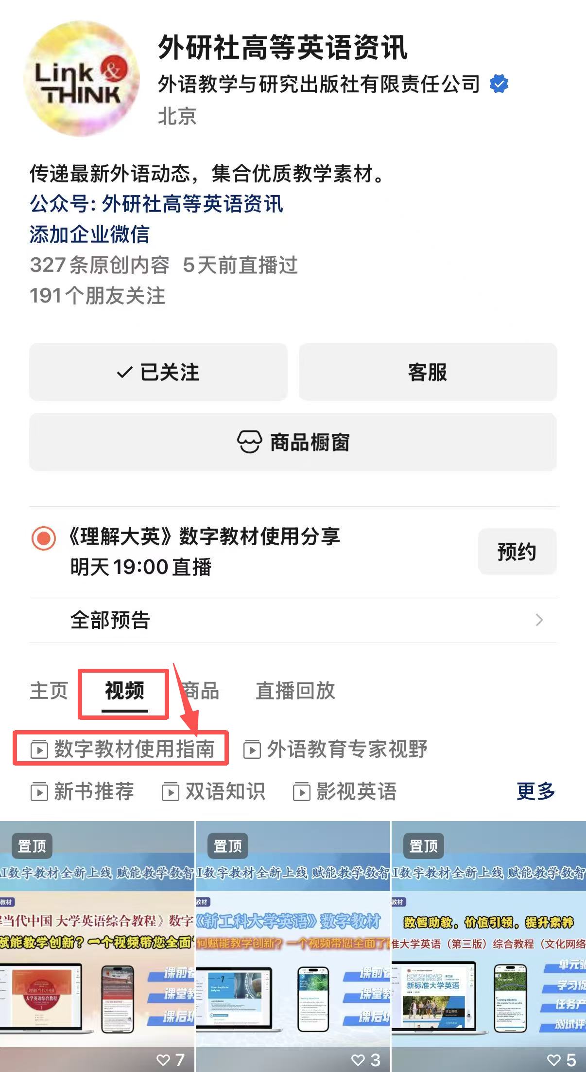 扫描以下二维码进入“外研社高等英语资讯”视频号主页,点击“数字教材使用指南”合集,查看数字教材使用攻略。